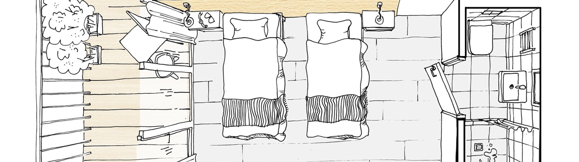 Kambarys su dviem atskiromis arba viena dvigule lova, su vaizdu į marias arba ramų vidinį kiemą. Dizaino sprendimai subtiliai integruoti į natūralią marinistinę aplinką, o mini terasa prie kambario leidžia mėgautis skania ryto kava stebint jachtų uosto šurmulį.